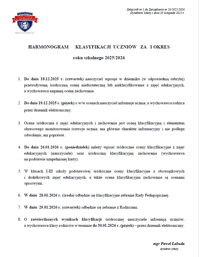 Harmonogram rozpoczęcia roku szkolnego 2025/2026