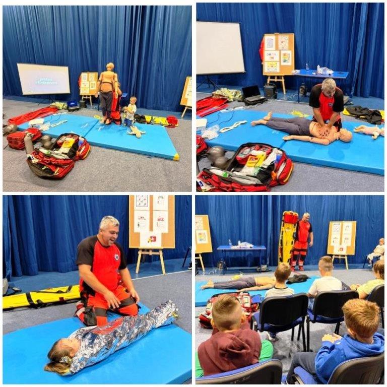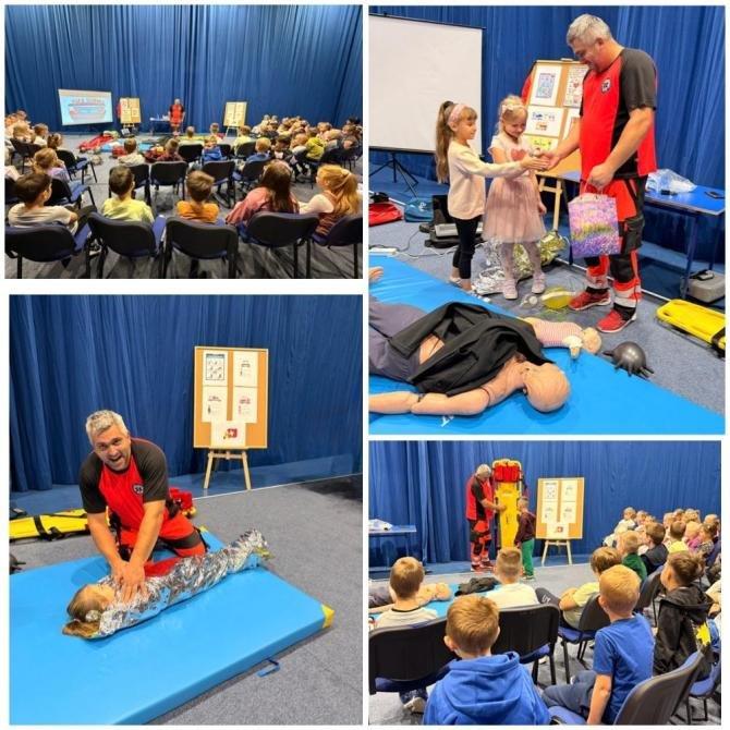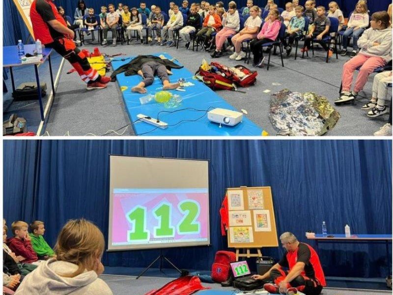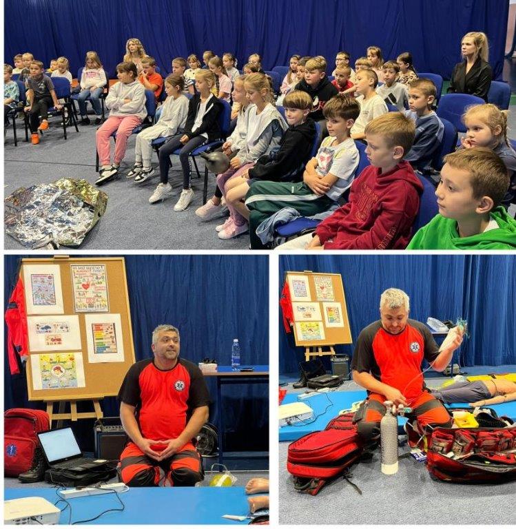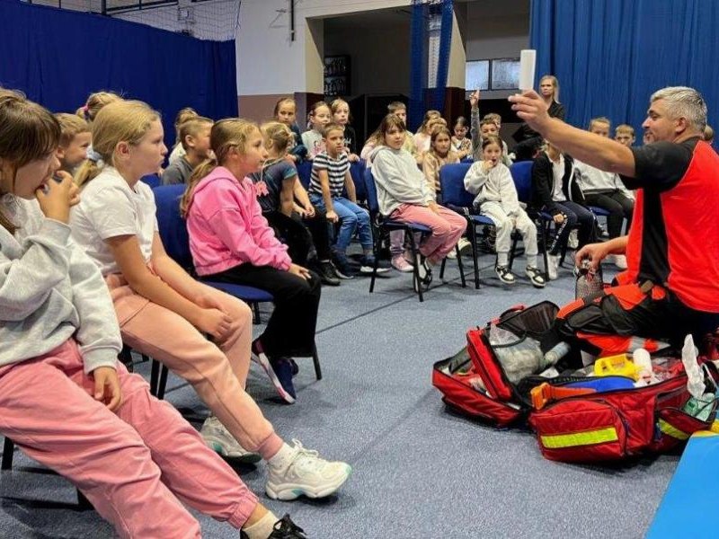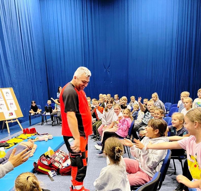 W dniu 26 września 2025 roku w naszej szkole odbyło się niezwykle interesujące spotkanie z ratownikiem medycznym – panem Grzegorzem Bulzakiem. Podczas wizyty pan ratownik opowiedział uczniom, na czym polega jego praca i z jakimi wyzwaniami spotyka się każdego dnia. Dzieci z zaciekawieniem obejrzały film edukacyjny, który w prosty sposób pokazał, jak udzielać pierwszej pomocy i dlaczego szybka reakcja może uratować komuś życie. Pan Grzegorz zaprezentował również profesjonalnie wyposażoną torbę ratownika medycznego, wyjaśniając, do czego służą poszczególne przedmioty. Dzieci miały okazję zobaczyć m.in. bandaże, opatrunki, maseczki do resuscytacji oraz ciśnieniomierz. W trakcie spotkania uczniowie uczyli się, jak zachować się w sytuacjach zagrożenia życia, czy też jak poprawnie wezwać pomoc, dzwoniąc na numer alarmowy 112. Ratownik przypomniał również, jak ważne jest dbanie o zdrowie – zdrowe odżywianie, codzienna higiena oraz unikanie niebezpiecznych sytuacji mogą zapobiec wielu problemom. Serdecznie dziękujemy panu Grzegorzowi Bulzakowi za kolejną wizytę w naszej szkole oraz za ciekawe, pełne pasji i praktycznej wiedzy zajęcia. Już nie możemy się doczekać następnego spotkania!