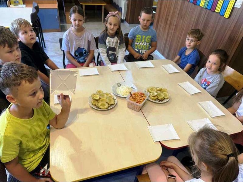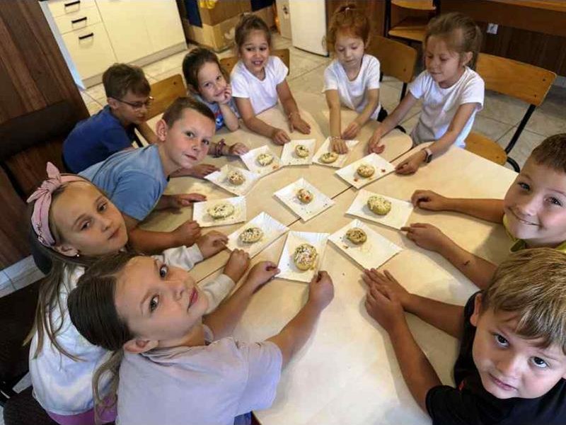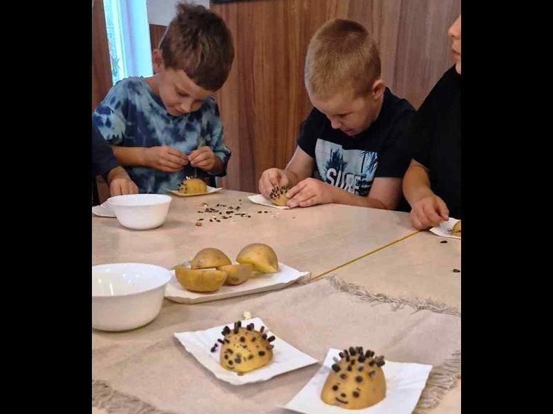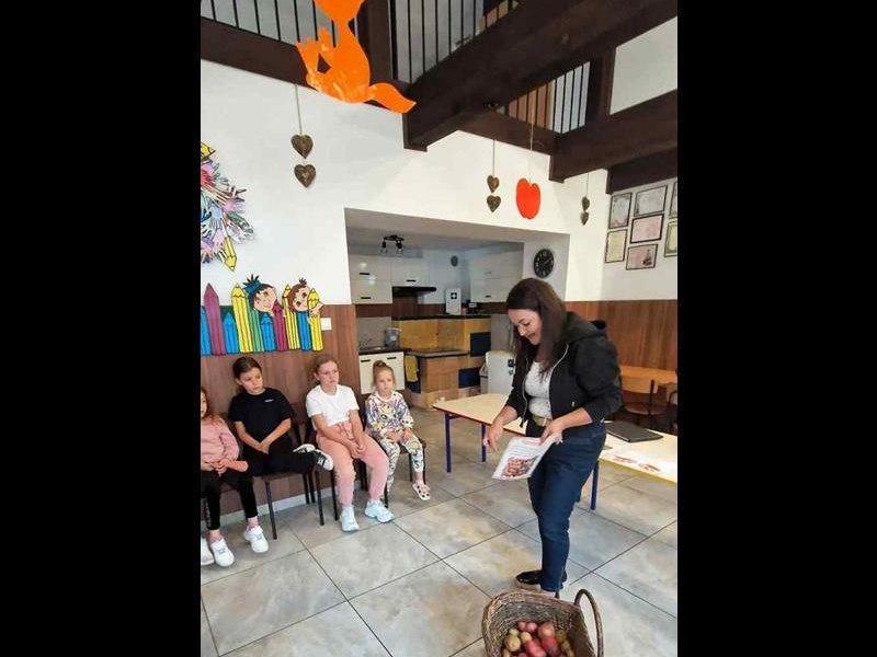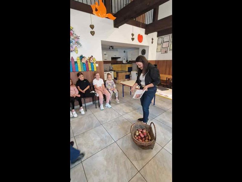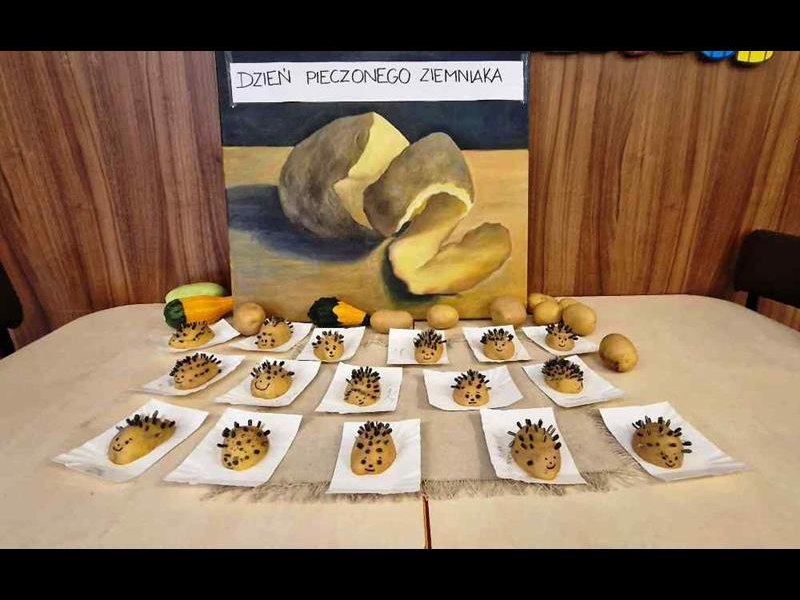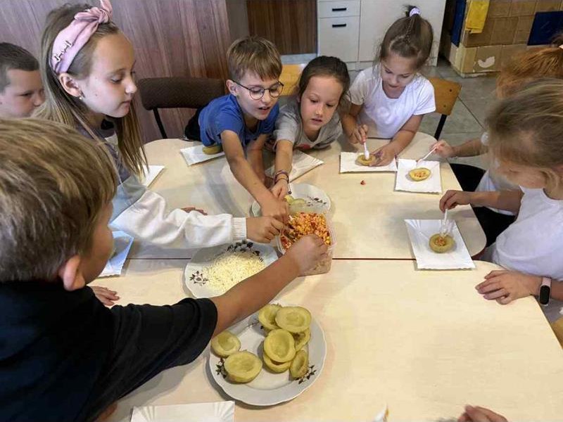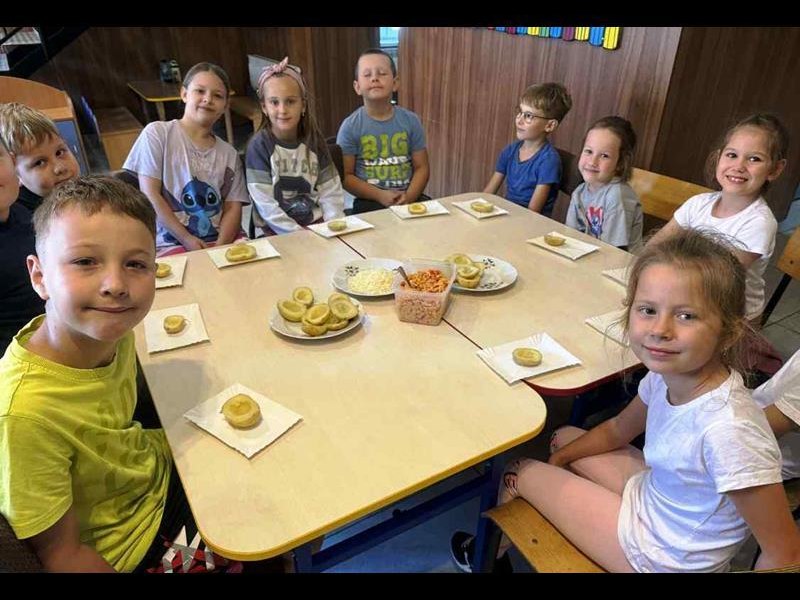W świetlicy szkolnej odbyły się wyjątkowe zajęcia z okazji Dnia Ziemniaka. Była to doskonała okazja, aby w niecodzienny i ciekawy sposób poszerzyć wiedzę oraz wspólnie spędzić czas. Naszym szczególnym gościem była pani Agata Kwit z Gospodarstwa Edukacyjnego w Zielonym Gaju, która w niezwykle interesujący sposób przedstawiła dzieciom tematykę związaną z ziemniakiem. Uczniowie dowiedzieli się, skąd pochodzi ta popularna roślina, poznali jej różne odmiany i ich zastosowanie w kuchni. Pani Agata zwróciła uwagę na bogaty skład odżywczy ziemniaków, dzięki któremu są one ważnym elementem codziennej diety. Nie zabrakło również rozmowy o różnorodnych potrawach ziemniaczanych, które goszczą na naszych stołach – od klasycznego purée i frytek, aż po bardziej wyszukane dania. Część praktyczna zajęć była równie pasjonująca. Dzieci miały możliwość przyjrzenia się procesowi uprawy ziemniaka, a następnie samodzielnie przygotowały faszerowane pieczone ziemniaki. Do degustacji uczniowie zaprosili Dyrektora szkoły Pana Pawła Łabudę, oraz Panią Dyrektor Lidię Zbieg. Nie brakowało przy tym radości i kulinarnej kreatywności. Dodatkową atrakcją były zajęcia plastyczno-techniczne, podczas których uczniowie wykonali wesołe jeżyki z ziemniaków oraz wykonanie pieczątek. Ta forma pracy pozwoliła połączyć zdobytą wiedzę z twórczą zabawą i rozwijaniem zdolności manualnych.