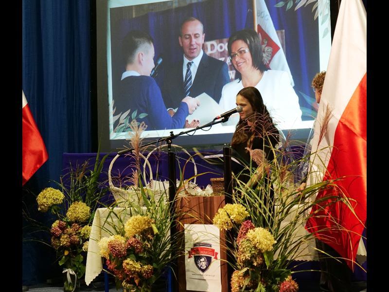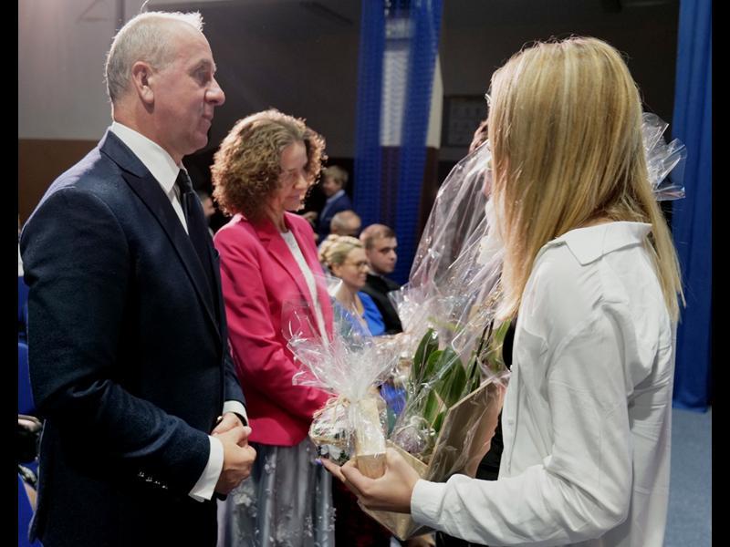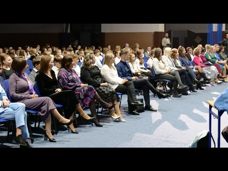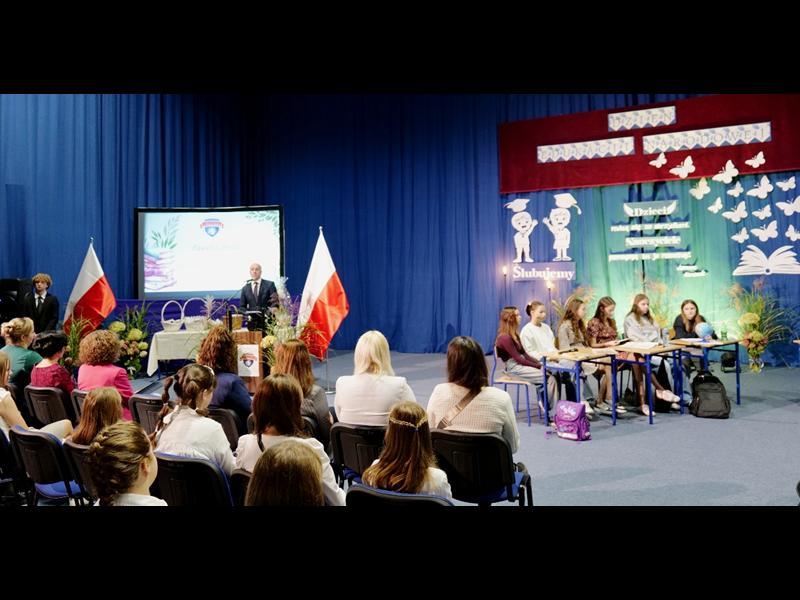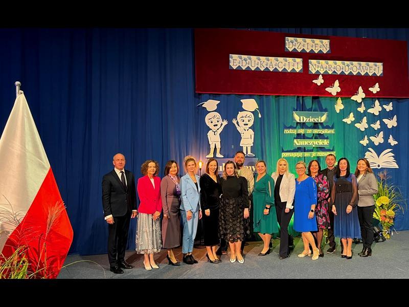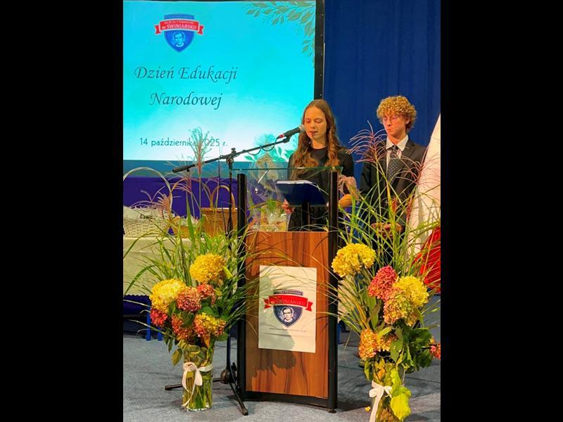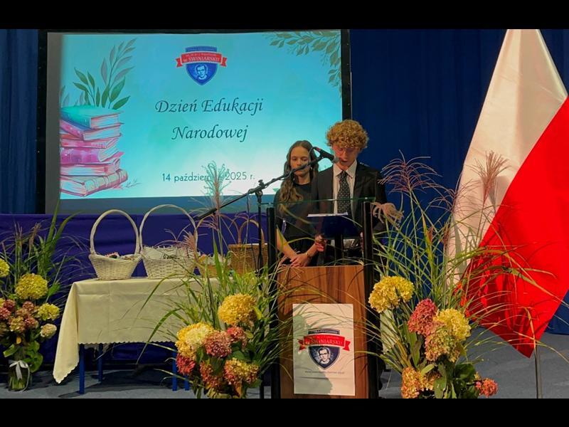 Uroczystość rozpoczęła się od wprowadzenia pocztu sztandarowego i odśpiewania hymnu narodowego. Następnie głos zabrał Pan Dyrektor Paweł Łabuda, który złożył wszystkim pracownikom szkoły serdeczne życzenia z okazji ich święta. W swoim przemówieniu podkreślił znaczenie misji nauczyciela oraz wyraził uznanie dla całego grona pedagogicznego za zaangażowanie i pasję w codziennej pracy dydaktyczno-wychowawczej.