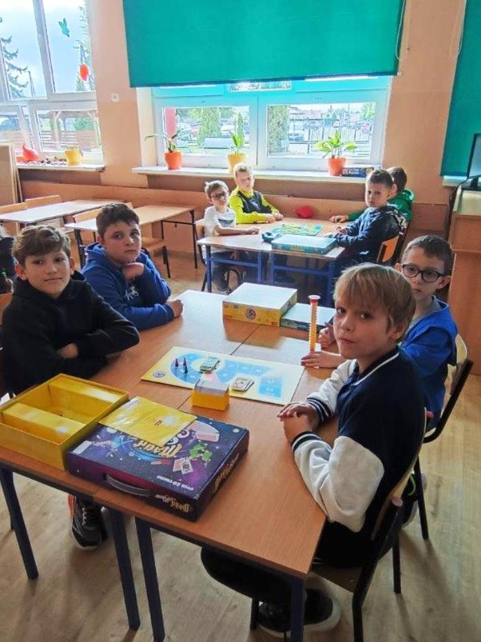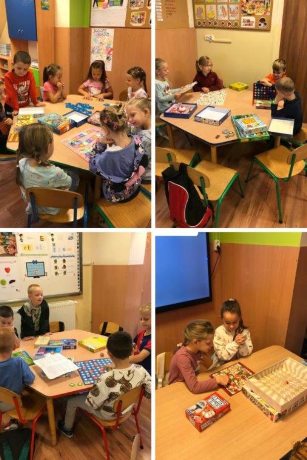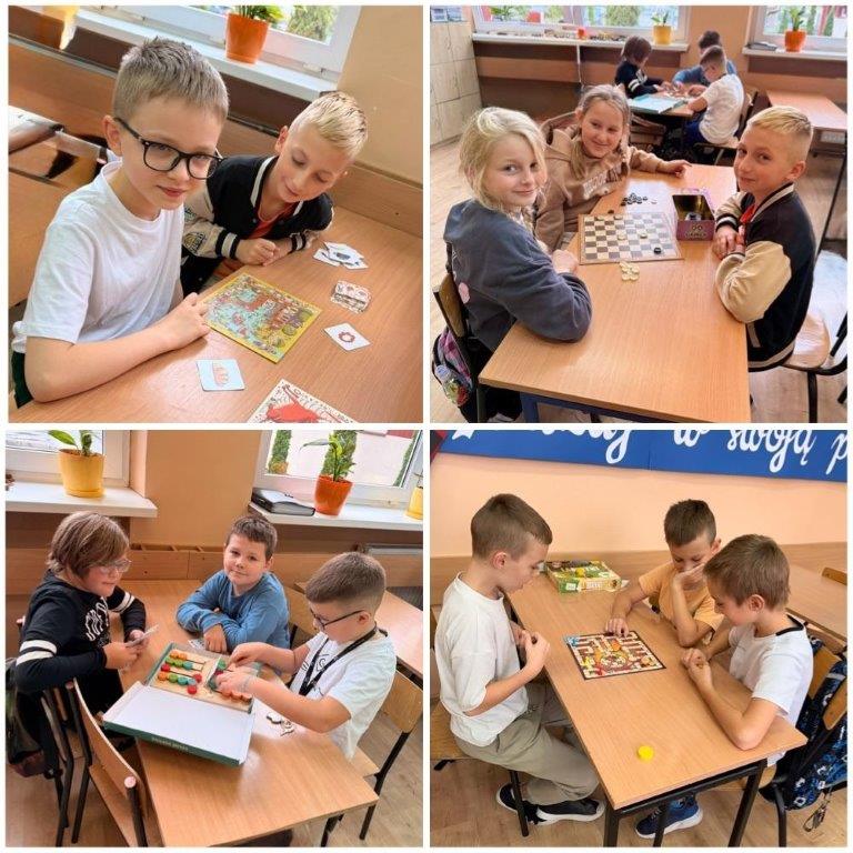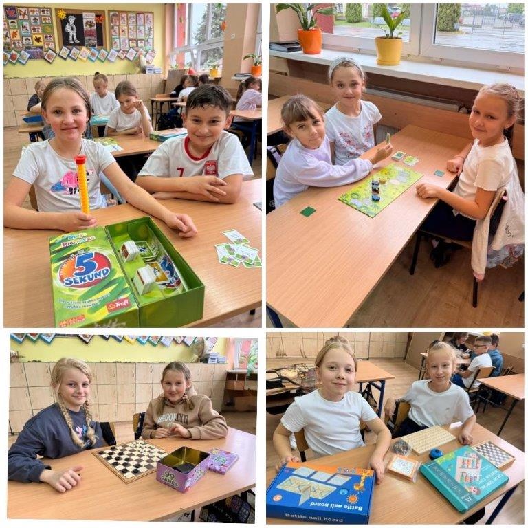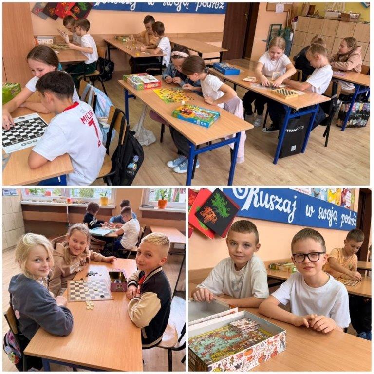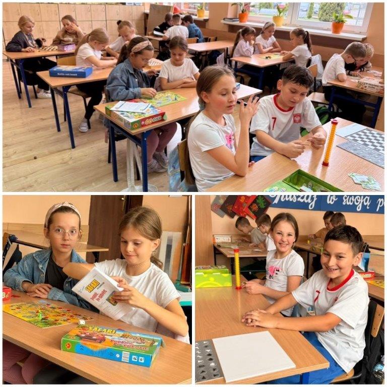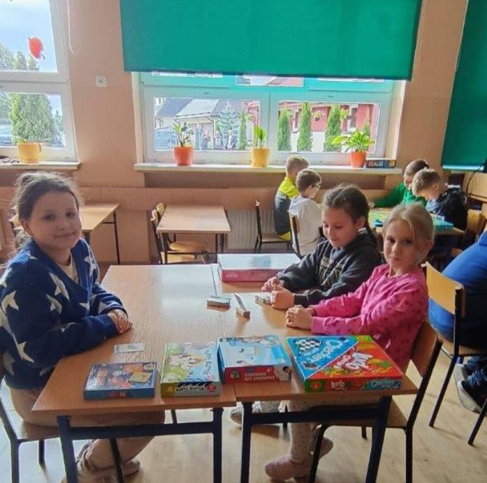 Dnia 10 października 2025r. w naszej szkole odbył się Dzień Gier Planszowych. W wydarzeniu wzięli udział uczniowie klas 0-3, którzy mieli okazję wspólnie spędzić czas, grając w różnorodne gry planszowe, karciane oraz logiczne. Celem wydarzenia było promowanie alternatywnych form spędzania czasu wolnego, integracja uczniów oraz rozwijanie umiejętności logicznego myślenia i zdrowej rywalizacji. Dzięki wspólnej zabawie panowała bardzo miła i koleżeńska atmosfera. Uczniowie chętnie uczyli się zasad nowych gier, pomagali sobie nawzajem i z zaangażowaniem uczestniczyli w rozgrywkach.