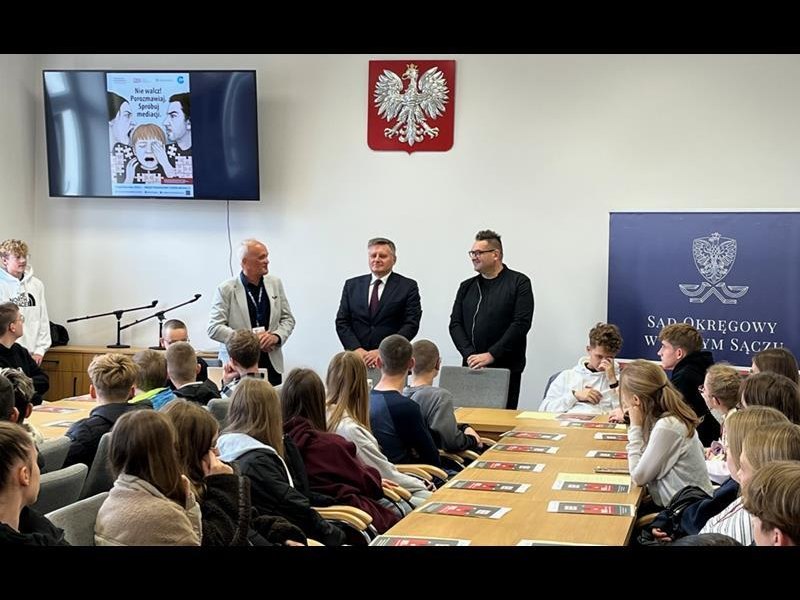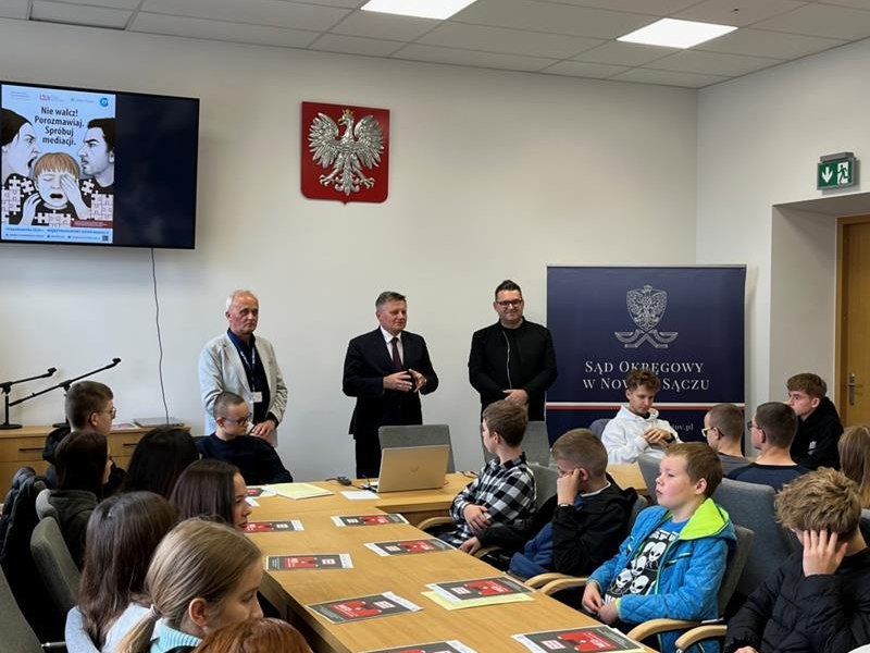 Wzięli również udział w wykładzie mediatora Andrzeja Brzezińskiego. Dowiedzieli się, jak ważna jest w życiu codziennym mediacja i, że konflikty można rozwiązywać dzięki rozmowie i pomocy mediatora. Uczniowie byli pod wrażeniem, jak istotna jest umiejętność porozumiewania się i rozwiązywania sporów w pokojowy i cywilizowany sposób. Ponadto dowiedzieli się, że mediacja umożliwia szczerą rozmowę, omówienie potrzeb i interesów każdej ze stron. Bez stresu,który towarzyszy na sali sądowej.