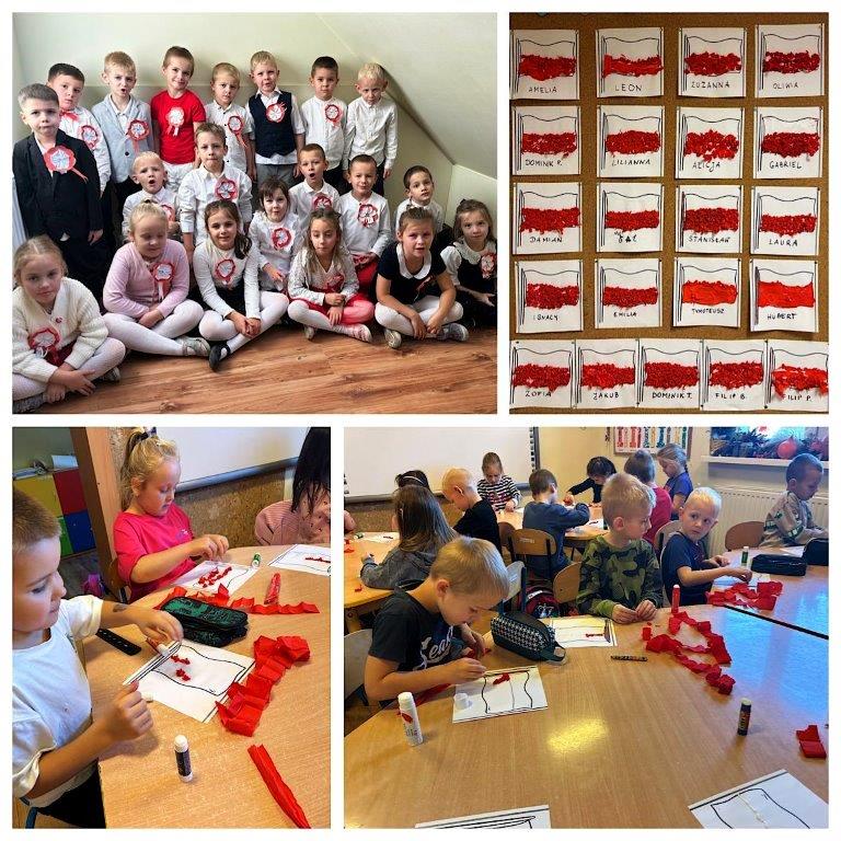 W ramach Tygodnia Patriotycznego każdego dnia rozpoczynaliśmy od uroczystego śpiewania hymnu narodowego. Dzieci dumnie odśpiewywały "Mazurka Dąbrowskiego", ucząc się równocześnie kultury i historii Polski. Następnie wspólnie wykonywaliśmy flagi i kotyliony, ozdabiając nimi nasze klasy. Dzieci przystępowały do tej czynności z pełnym zaangażowaniem i radością. W trakcie Tygodnia Patriotycznego organizowaliśmy także quizy patriotyczne, które sprawdzały wiedzę uczniów na temat flagi, hymnu, czy historii Polski. Była to doskonała okazja do przypomnienia i poszerzenia wiedzy na temat naszego kraju. Każdy dzień Tygodnia Patriotycznego miał swój motyw kolorystyczny, a Dzień Koloru Czerwonego był szczególnie barwny! Uczniowie i nauczyciele ubrani byli w czerwone barwy, a szkolne korytarze wypełnione były czerwonymi dekoracjami. Nie zabrakło również czasu na kolorowanki patriotyczne i wierszyki o tematyce narodowej. Dzieci z wielkim zapałem malowały i recytowały swoje dzieła, przeżywając radość ze wspólnego tworzenia.
