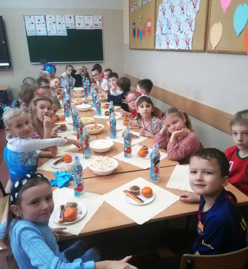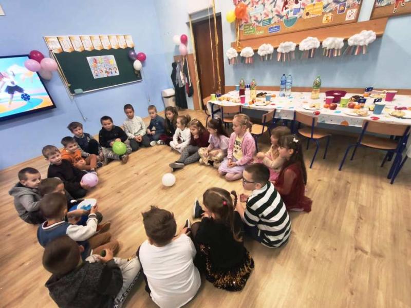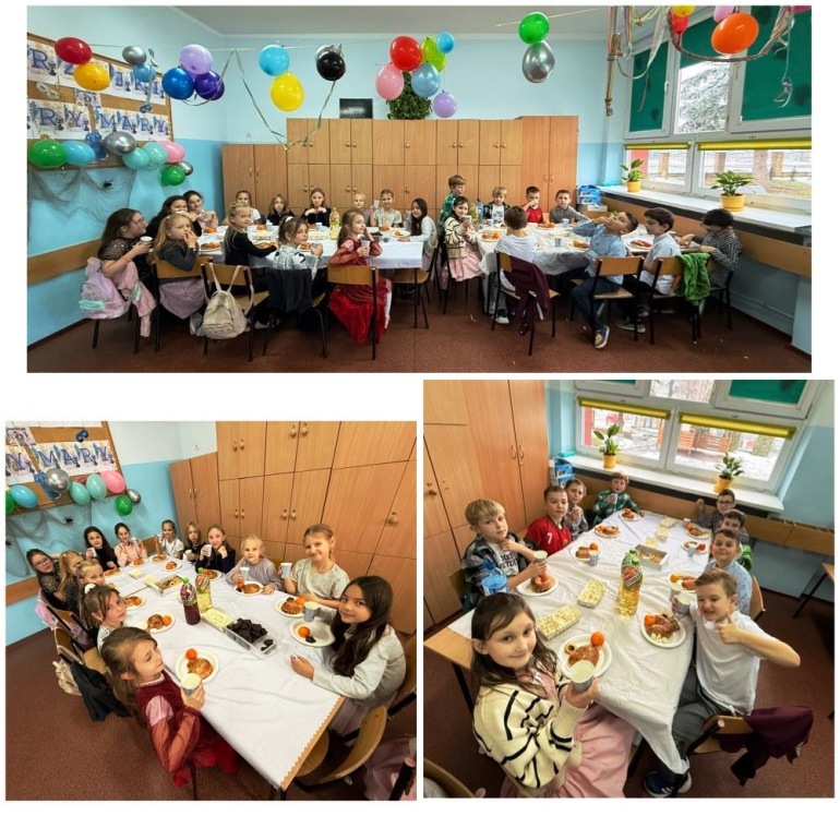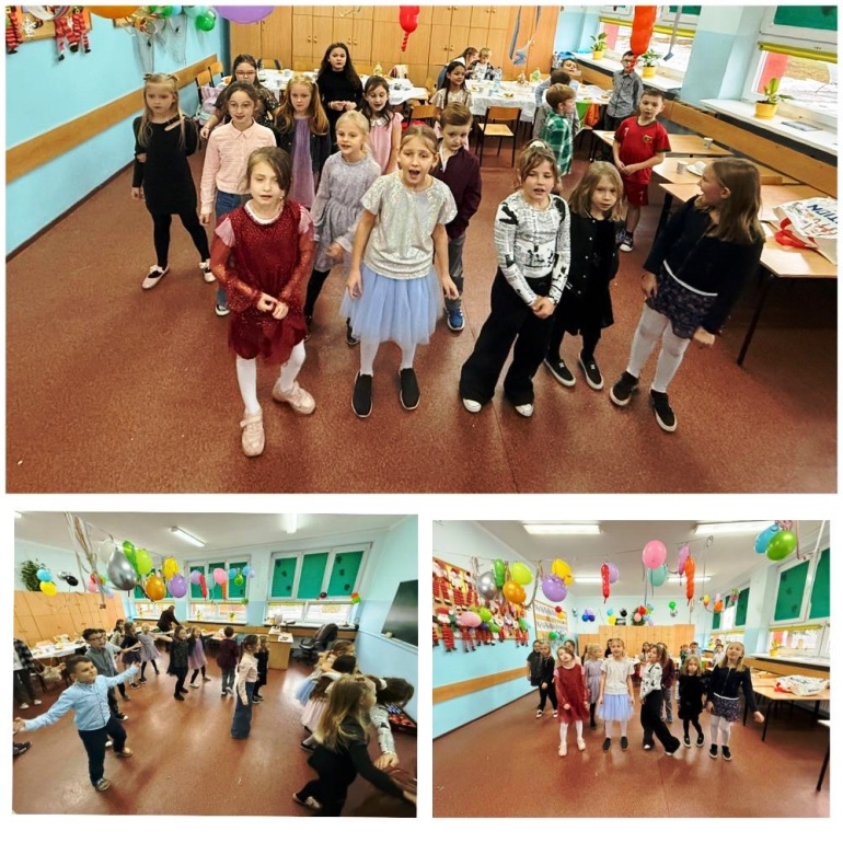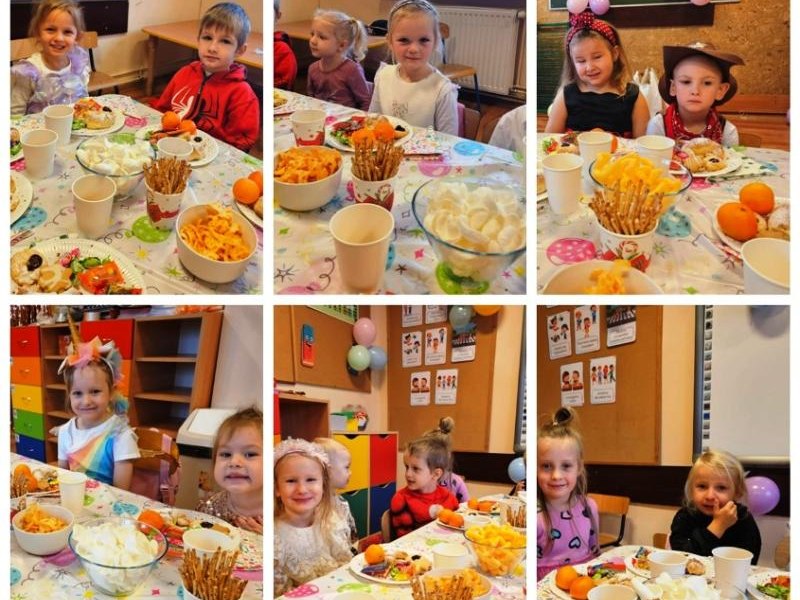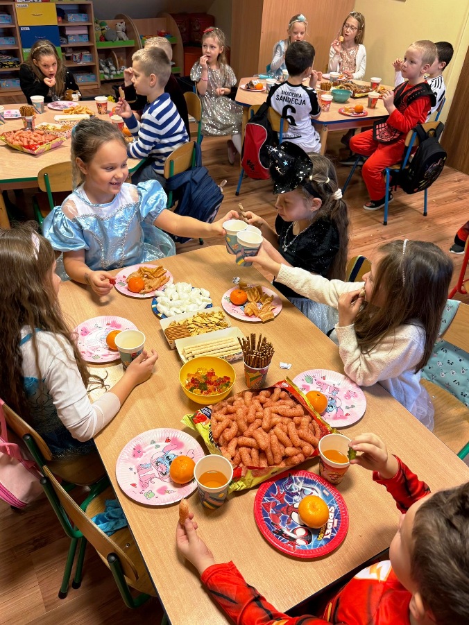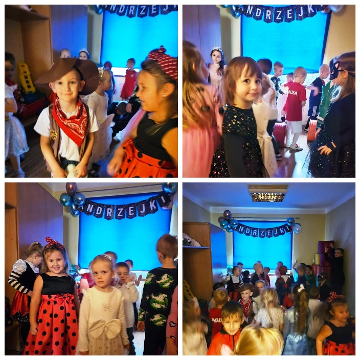 Po części wróżbiarskiej odbyły się tańce i zabawy muzyczne. Dzieci świetnie bawiły się przy znanych piosenkach, tworząc wspólne układy taneczne i biorąc udział w konkursach ruchowych. Rodzice przygotowali dla dzieci poczęstunek, który urozmaicił nasze świętowanie. Na stołach pojawiły się owoce, ciastka, babeczki oraz napoje. Dzieci z apetytem częstowały się smakołykami i wspólnie spędzały czas przy stole, dzieląc się wrażeniami z wróżb.