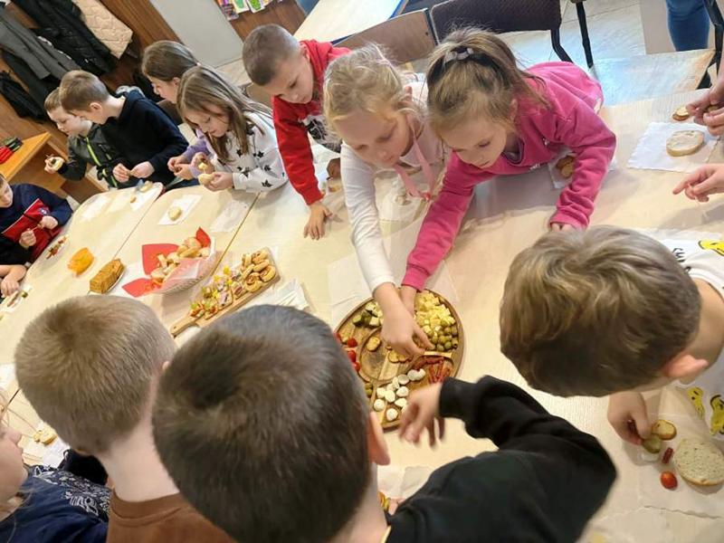 W szkolnej świetlicy odbyły się wyjątkowe zajęcia kulinarne pod hasłem „Andrzejkowe przekąski”. Dzieci z ogromnym zaangażowaniem przygotowywały własne, kolorowe i smaczne przekąski. Na początku przypomniały sobie najważniejsze zasady higieny obowiązujące podczas przygotowywania posiłków – dokładne mycie rąk, czystość stanowiska pracy oraz bezpieczne korzystanie z narzędzi kuchennych. Następnie przyszedł czas na twórczą zabawę w kuchni. Uczniowie samodzielnie komponowali swoje przekąski, dobierając ulubione dodatki i eksperymentując ze smakami. Z przygotowanymi przysmakami dzieci udały się do Pani Dyrektor Lidii Zbieg, aby ją poczęstować i podzielić się efektami swojej pracy. Spotkało się to z ogromną radością i uznaniem. Zajęcia przebiegły w radosnej, pełnej śmiechu atmosferze. Uczestnicy świetnie się bawili, rozwijając swoje kulinarne umiejętności, kreatywność oraz współpracę w grupie. To były naprawdę smakowite andrzejkowe chwile!