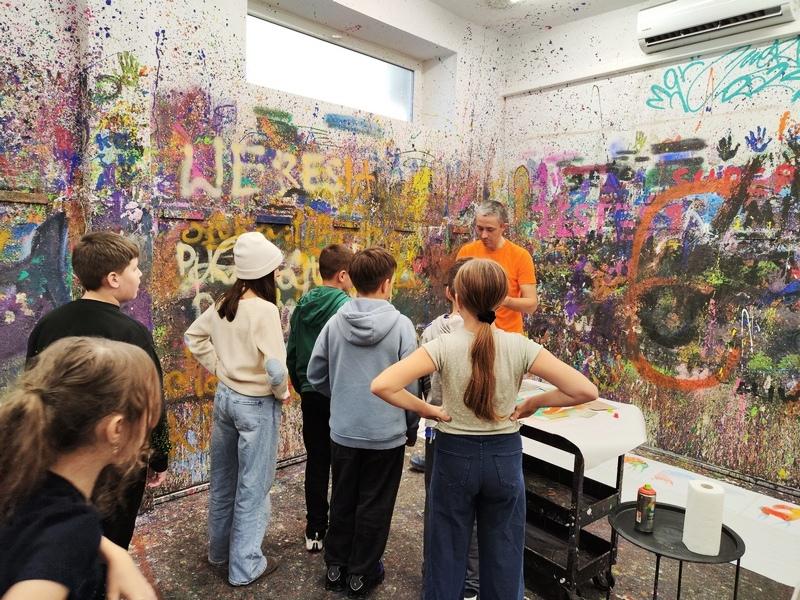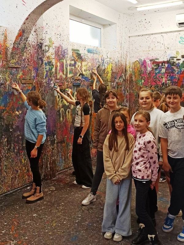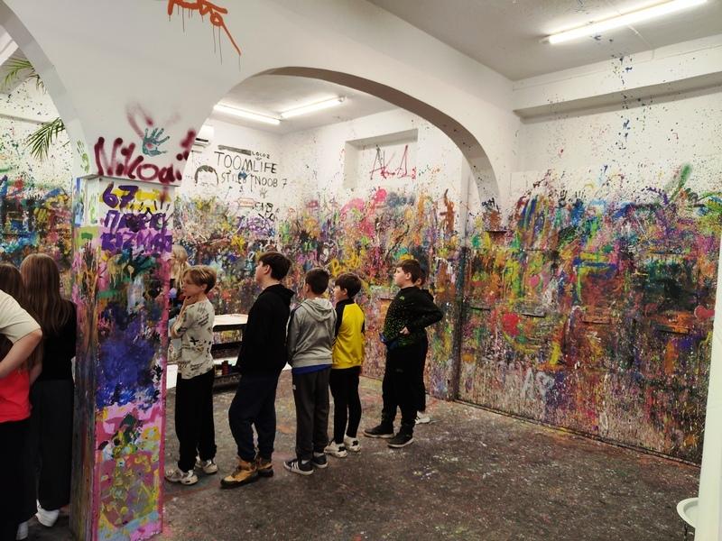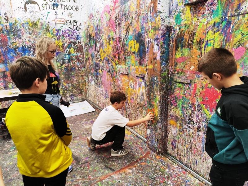 Kolejnym punktem programu były warsztaty graffiti w Pokoju Ekspresji – wyjątkowej przestrzeni stworzonej dla osób pragnących swobodnie rozwijać swoją kreatywność. Uczestnicy mogli malować, wykorzystując nietypowe narzędzie, jakim była dla nich puszka farby w sprayu. Warsztaty dostarczyły im wiele radości i stanowiły okazję do twórczego eksperymentowania. Na zakończenie każdy z uczniów otrzymał wykonaną przez siebie pracę.