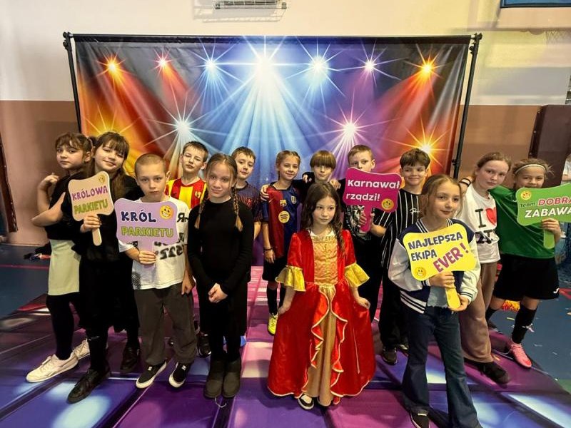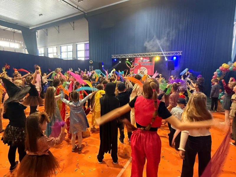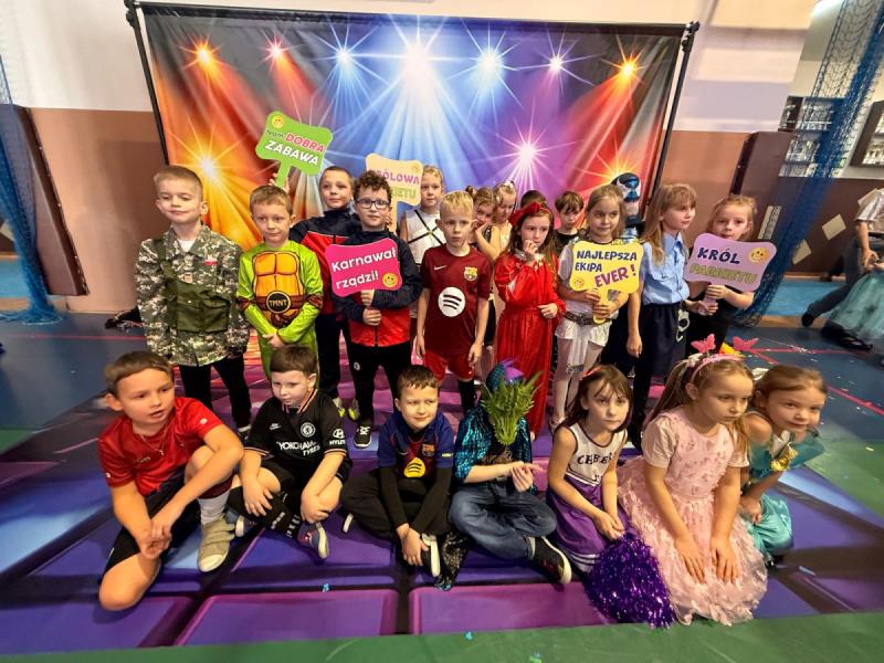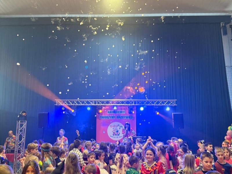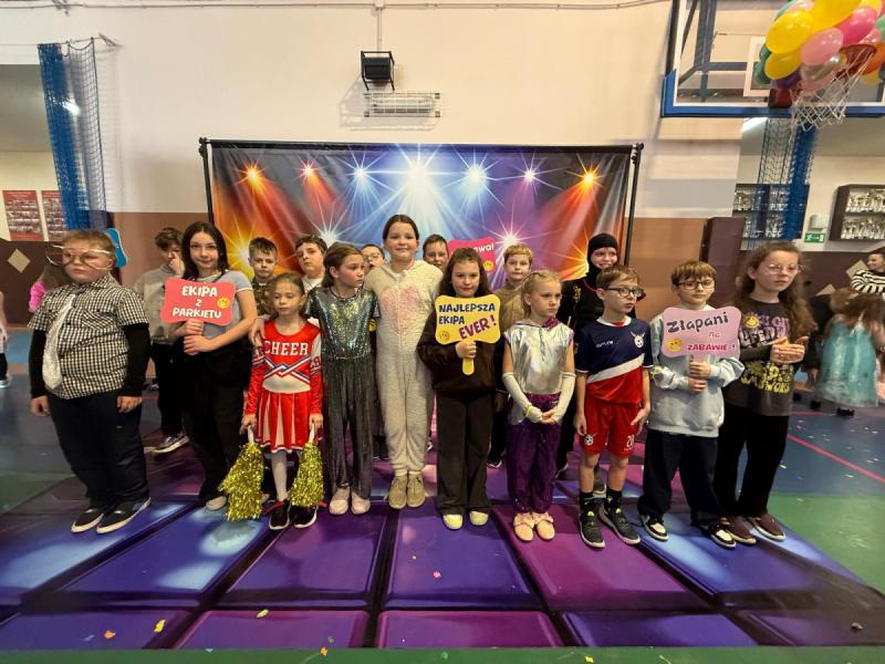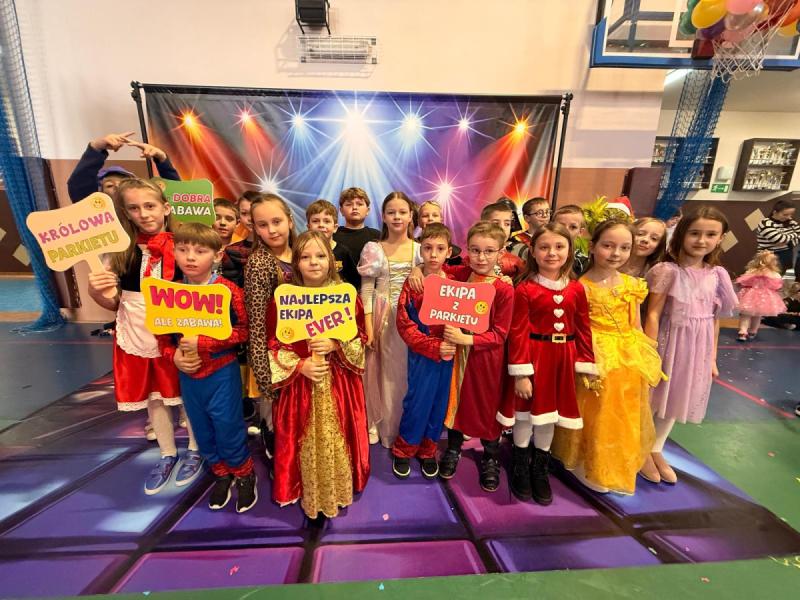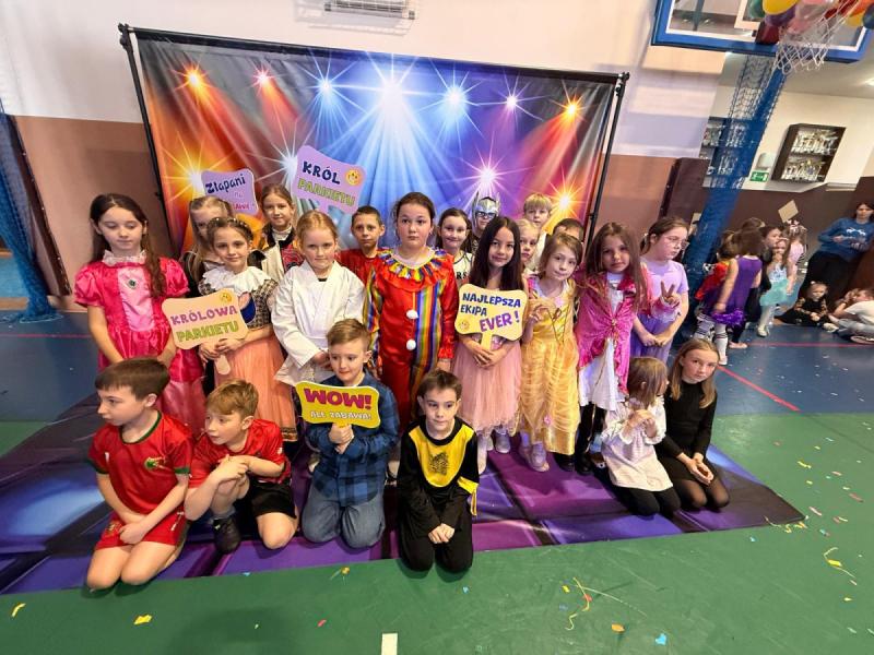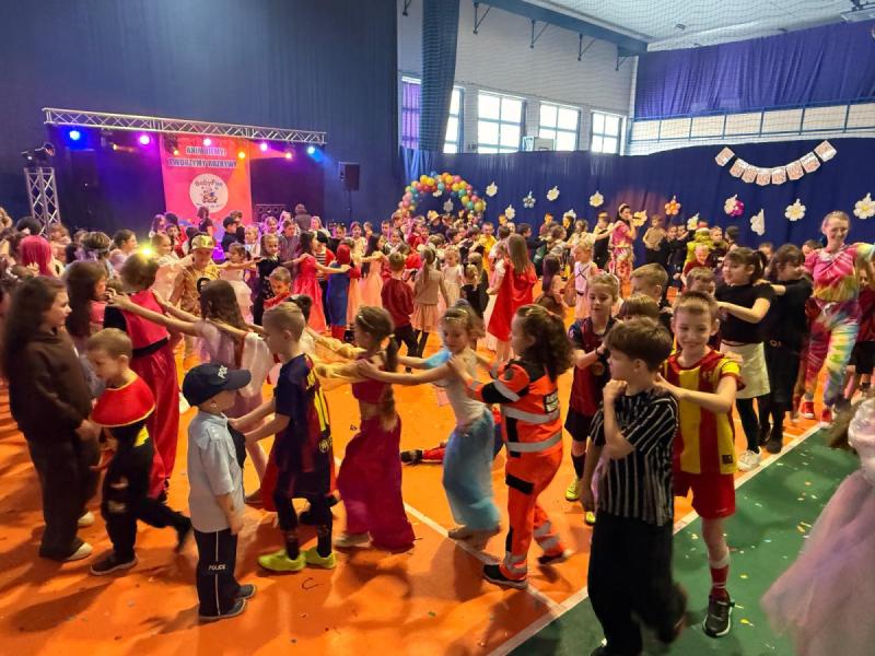 Dnia 15 stycznia 2026 roku uczniowie klas 0–III wzięli udział w niezwykle radosnej i kolorowej zabawie karnawałowej, którą profesjonalnie poprowadzili animatorzy z grupy BabyFun. Sala gimnastyczna zamieniła się w prawdziwą salę balową wypełnioną postaciami z bajek, superbohaterami i barwnymi motylami, a radosna muzyka od samego rana zachęcała wszystkich do wspólnych pląsów. Ekipa BabyFun zapewniła dzieciom moc atrakcji, wciągając je do dynamicznych układów tanecznych, pomysłowych konkursów zręcznościowych oraz zabaw z ogromną balonową piłką. Wyjątkową atmosferę dopełniły efekty specjalne, w tym sztuczny śnieg, tysiące baniek mydlanych, które wzbudziły ogromny zachwyt wśród najmłodszych uczestników. W przerwach między tanecznymi szaleństwami dzieci odpoczywały w klasach przy słodkim poczęstunku, dzieląc się wrażeniami z rówieśnikami. Dzięki wielkiemu zaangażowaniu prowadzących oraz kreatywności rodziców, którzy przygotowali wspaniałe stroje, tegoroczny bal stał się niezapomnianym przeżyciem pełnym uśmiechu i zintegrował całą społeczność klas młodszych. Kiedy czas zabawy dobiegł końca dzieci z żalem opuściły salę gimnastyczną. Jednak do domów wracały we wspaniałych humorach, dzieląc się z rodzicami swoimi przeżyciami.