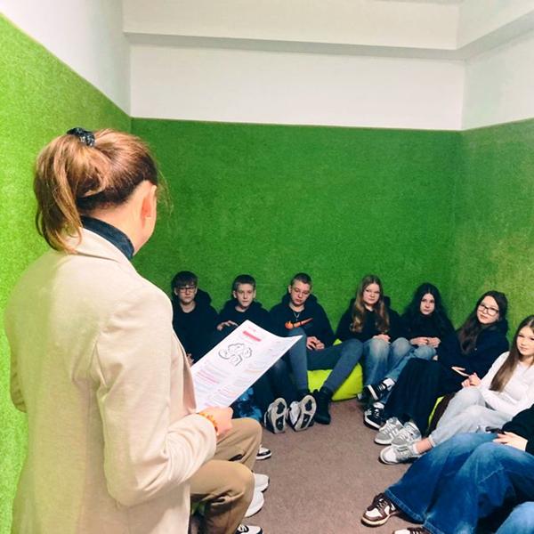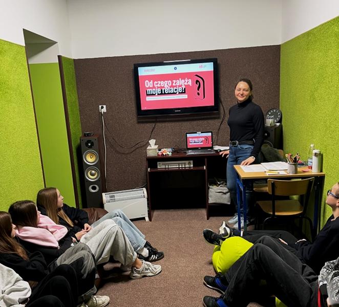 Pokój „wyciszeń” – w naszej szkole powstało tzw. miejsce w którym króluje cisza i spokój. W tym pomieszczeniu odbywa się wiele zajęć, spotkań, które pozwalają uczniom i nauczycielom w komfortowych warunkach rozmawiać i poruszać wiele tematów zarówno z klasą, jak i indywidualnie. Jest to dla szkoły bardzo ważne miejsce, które dzięki zaangażowaniu wielu osób mogło urzeczywistnić się i być udostępnione dla uczniów i nauczycieli. W dniu 8 stycznia w klasach: VII a, VII b, VII c, VIII a i VIII b rozpoczęto realizację programu profilaktycznego „RÓWIEŚNICY" opracowanego przez zespół specjalistów Fundacji Dajemy Dzieciom Siłę. Zajęcia warsztatowe są prowadzone według gotowych scenariuszy oraz opierają się na mini serialu "#SPOTTED". Głównym celem programu jest budowanie właściwych relacji rówieśniczych, zwiększanie poziomu empatii, zrozumienia oraz przeciwdziałania zachowaniami związanych z cyberprzemocą, budowaniem właściwych postaw i reakcji w sytuacji doświadczenia cyberprzemocy oraz bycia świadkiem występowania zachowań przemocowych w Internecie.