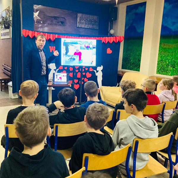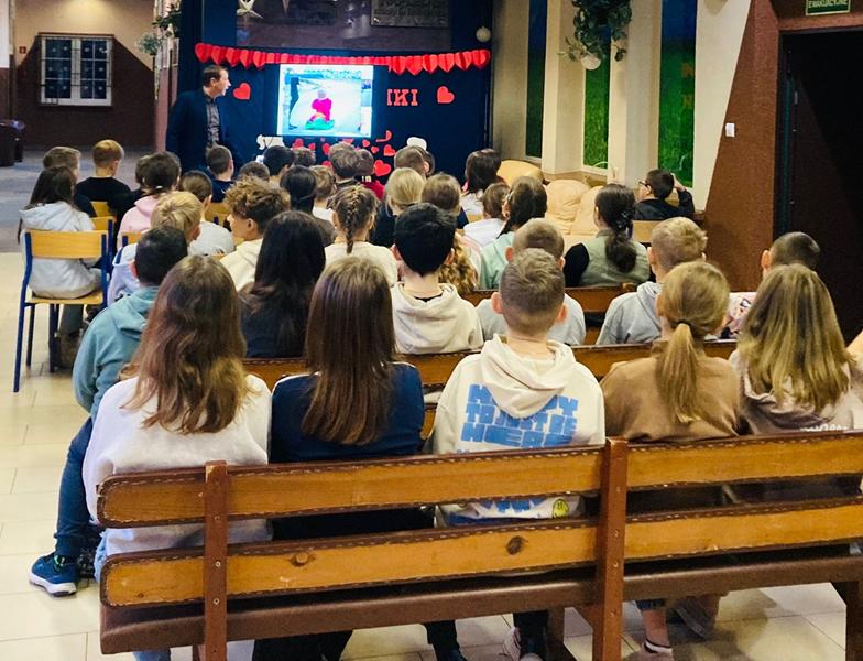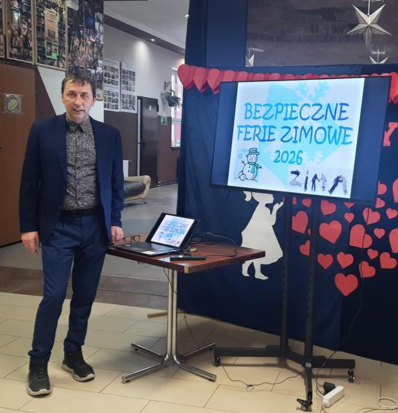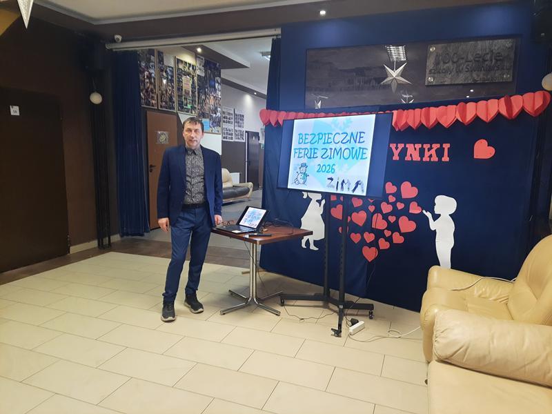 W dniu 29 stycznia 2026 r. odbyły się prelekcje dla uczniów klas IV-VIII na temat „Bezpiecznych ferii”. Dyrektor szkoły pan Paweł Łabuda podziękował panu Michałowi Mrzygłodowi, który już tradycyjnie od kilku lat przeprowadza prelekcję dotyczącą bezpieczeństwa podczas wypoczynku uczniów w czasie ferii zimowych, a także letnich. Uczniowie obejrzeli prezentację i mogli dowiedzieć się bardzo wiele istotnych, ważnych informacji dotyczących ich bezpieczeństwa.