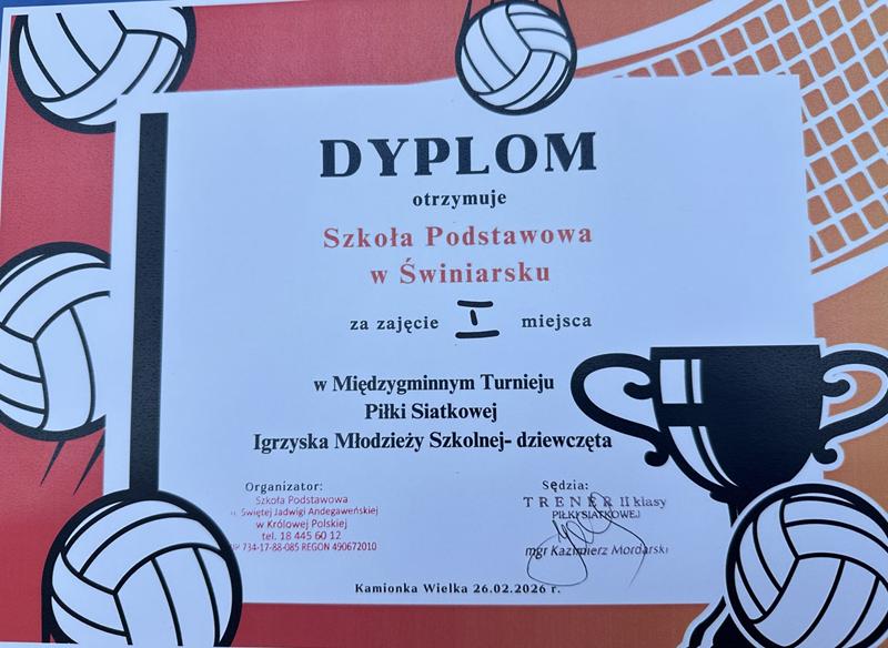 W dniu 26 lutego 2026 r. na hali sportowej w Kamionce Wielkiej odbył się Międzygminny Turniej Piłki Siatkowej -Igrzyska Młodzieży Szkolnej. W kategorii dziewcząt w rozgrywkach wzięły udział cztery drużyny: SP Brzezna, SP Kamionka Wielka, SP Tęgoborze oraz SP Świniarsko. Po raz kolejny reprezentacja naszej szkoły okazała się bezkonkurencyjna wygrywając wszystkie mecze 2:0. Tym samym dziewczęta zajęły 1 miejsce w turnieju i awansowały na zawody powiatowe, które odbędą się 24 marca w Marcinkowicach.