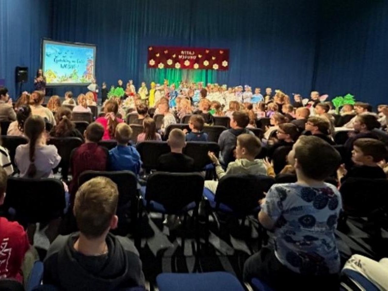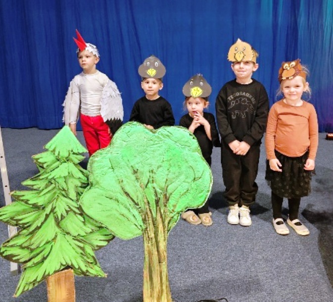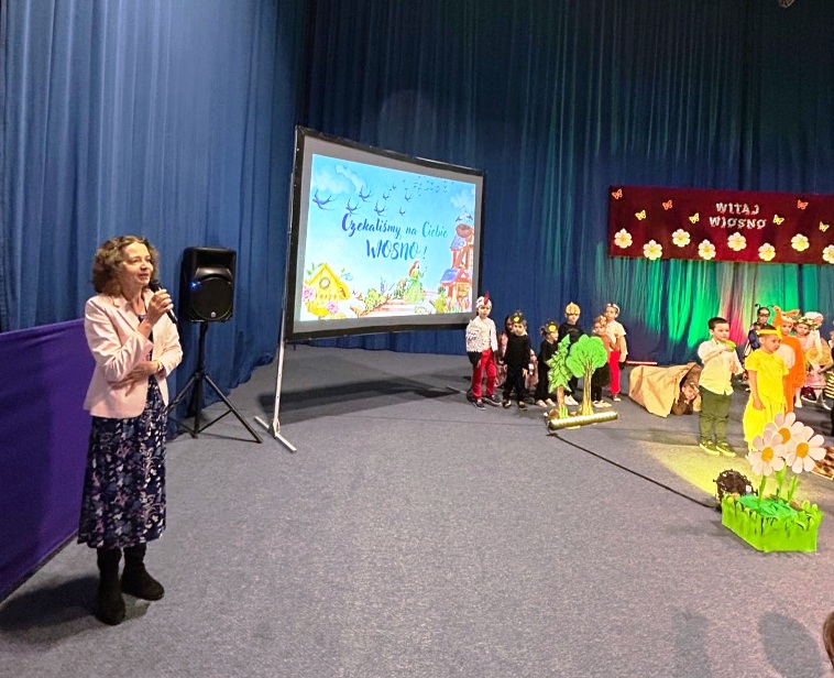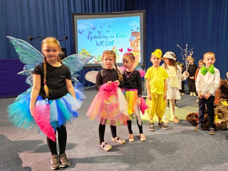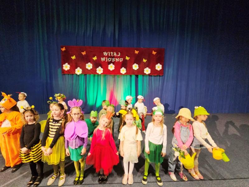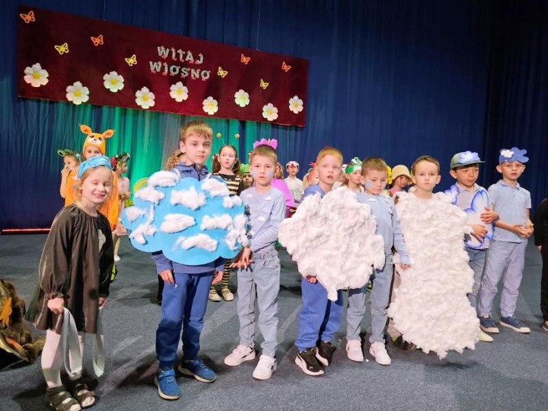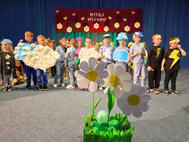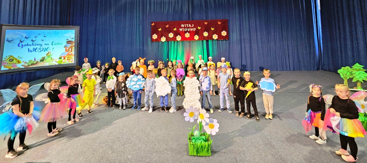 Na początku uroczystości głos zabrała Pani Dyrektor, mgr Lidia Zbieg, która serdecznie powitała przybyłych gości oraz skierowała kilka ciepłych słów na temat znaczenia powitania wiosny – jako czasu nadziei, odnowy i pozytywnych zmian. Następnie odbyło się wyjątkowe przedstawienie pt. „Powitanie Pani Wiosny” w wykonaniu oddziałów przedszkolnych. Mali artyści zachwycili publiczność swoim zaangażowaniem, barwnymi strojami oraz piękną interpretacją wiosennej tematyki. Na scenie pojawiły się ptaki, motyle, żaby, bociany, niedźwiedź, jeż oraz pszczółki. Nie zabrakło również bałwanka, symbolizującego odchodzącą zimę, oraz słoneczka zapowiadającego nadejście cieplejszych dni. Dzieci zaprezentowały także elementy przyrody i zjawiska pogodowe – burzę i chmury, które ustąpiły miejsca nadchodzącej wiośnie. Całość dopełniały liczne kwiaty oraz najważniejsza postać – Pani Wiosna, symbol odradzającej się przyrody i nowej energii. Występ był niezwykle barwny i pełen radości, a jego zakończenie zostało nagrodzone gromkimi brawami i wyrazami zachwytu ze strony zgromadzonej publiczności.