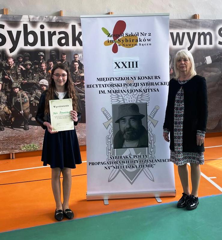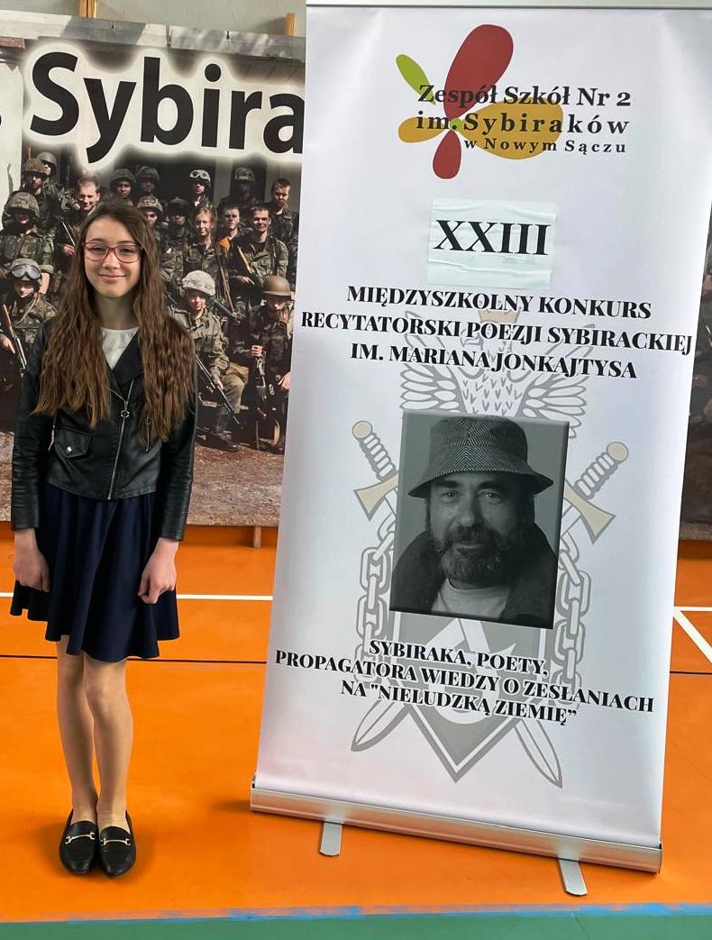 Uczennica klasy 5a, Zosia Romańska, zdobyła wyróżnienie w XXIII Międzyszkolnym Konkursie Recytatorskim Poezji Sybirackiej, który odbył się w Zespole Szkół nr 2 im. Sybiraków w Nowym Sączu.