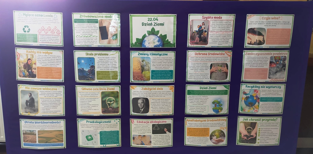 Na szkolnych korytarzach pojawiły się tematyczne gazetki, które przypominały o znaczeniu recyklingu, oszczędzania wody i energii oraz ochrony bioróżnorodności. Dzięki nim każdy mógł zatrzymać się na chwilę i zastanowić, jakie działania podejmuje na co dzień dla dobra naszej planety.