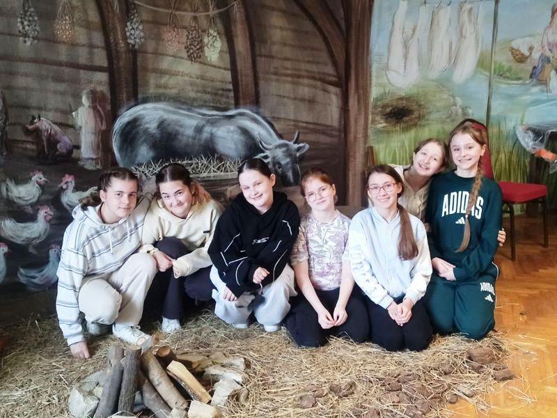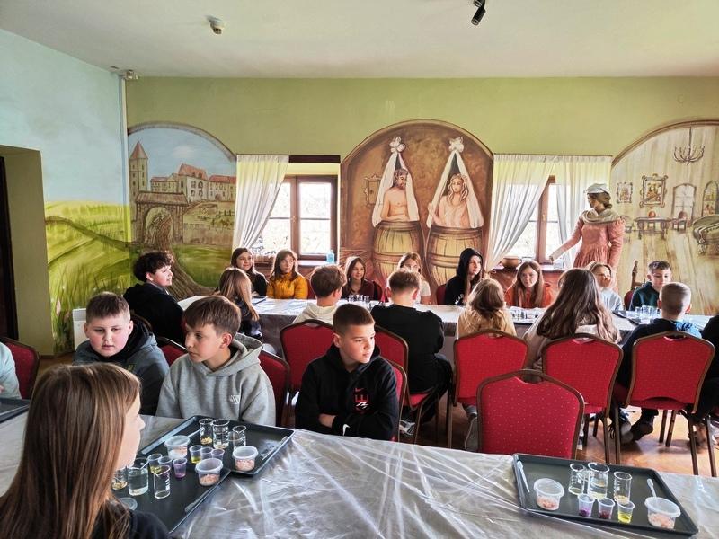 Kolejnym punktem programu były warsztaty edukacyjne pt. „Odczarować brud średniowiecza”, które w ciekawy i angażujący sposób przybliżyły uczniom realia codziennego życia w dawnych czasach. Uczniowie dowiedzieli się, jak wyglądała higiena w średniowieczu oraz jakich środków używano do dbania o czystość. Szczególne zainteresowanie wzbudziła część praktyczna – eksperymenty chemiczne, podczas których każdy uczestnik mógł samodzielnie przygotować naturalne środki myjące. Było to nie tylko wartościowe doświadczenie edukacyjne, ale również źródło ogromnej satysfakcji i radości.