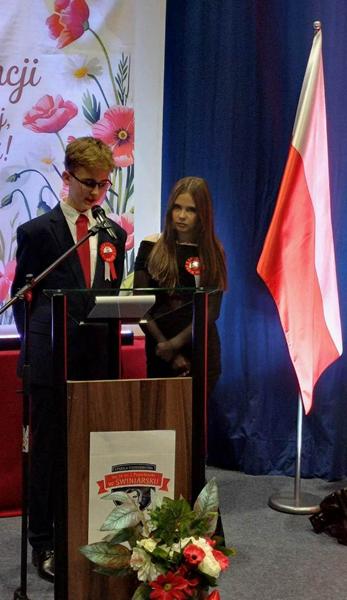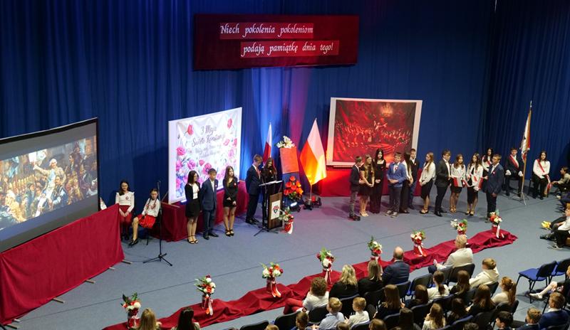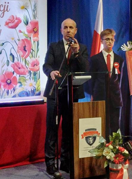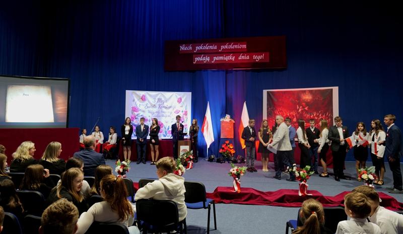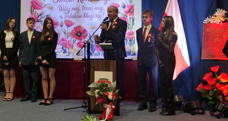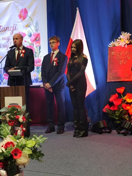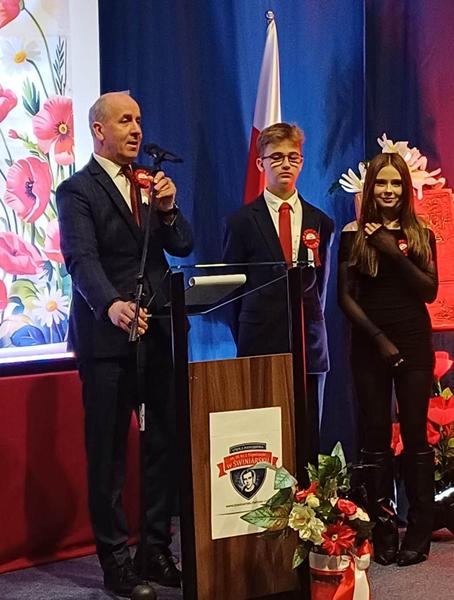 z refleksyjnym pytaniem, czym dla nich dziś jest patriotyzm i jak rozumieją jego współczesny wymiar. Podkreślił, że w obecnych czasach patriotyzm nie musi oznaczać wielkich czynów, lecz wyraża się w codziennych postawach- szacunku do drugiego człowieka oraz odpowiedzialności za wspólne dobro. Zauważył również, że Statut Szkoły można traktować jako swoistą „małą konstytucję”, która porządkuje życie społeczności szkolnej. Dyrektor Szkoły podziękował organizatorom p. Agnieszce Pietrzak, p. Stanisławowi Mosurkowi, p. Ewie Jonakowskiej-Żal, p. Joannie Kędroń, p. Dorocie Leśniak, p. Bartłomiejowi Fedko, a także pracownikom obsługi za ich zaangażowanie i wkład w przygotowanie akademii.
