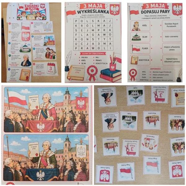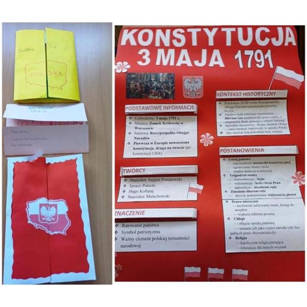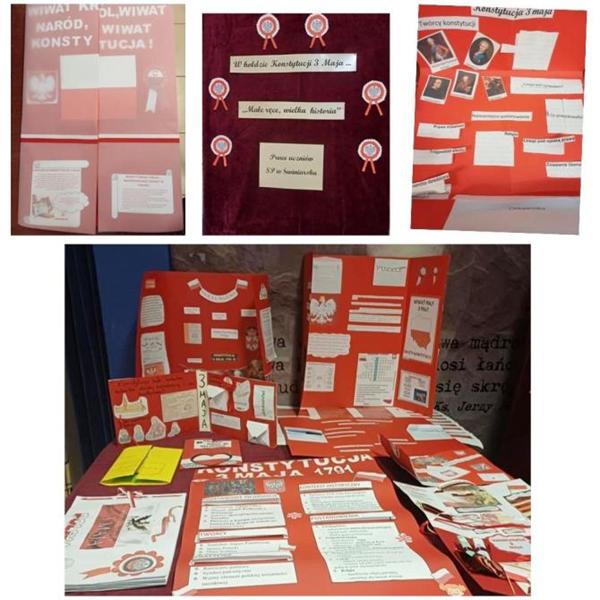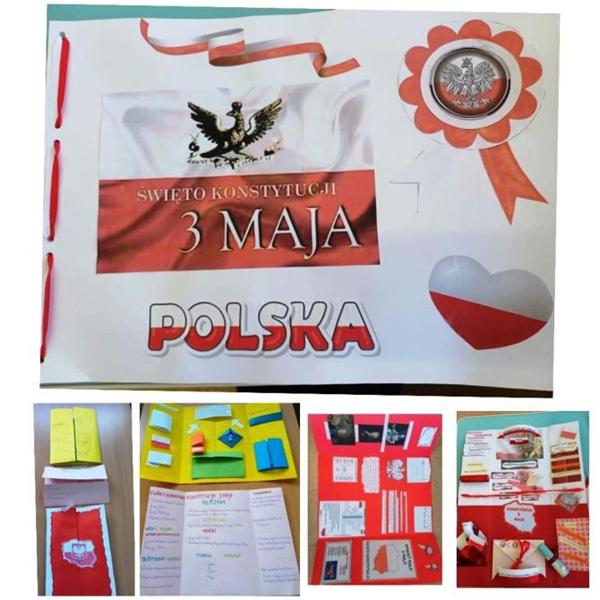 Uzupełnieniem obchodów majowych świąt były prace uczniów klas 5 i 6, którzy przygotowali kreatywne lapbooki poświęcone Konstytucji 3 Maja. Prace te zachwycają różnorodnością form i pomysłowością – zawierają ciekawostki historyczne, zagadki, puzzle oraz ukryte w kopertach informacje. Lapbooki można oglądać na szkolnym holu i stanowią one doskonałe dopełnienie wiedzy zdobytej podczas akademii.
